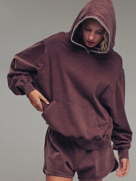 Vintage-Wash Crochet Trim Hooded Sweatshirt