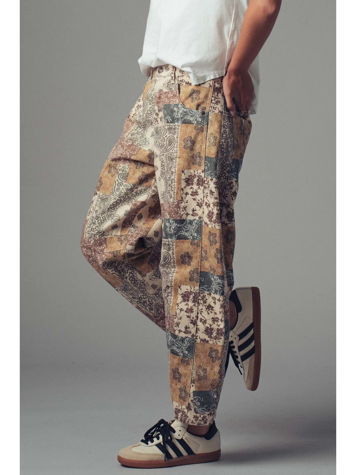 Bring effortless boho style to your spring 2025 collection with these patchwork denim pants featuring floral and paisley prints. The relaxed, wide-leg silhouette offers comfortable movement and pairs perfectly with western-inspired tops and vests.