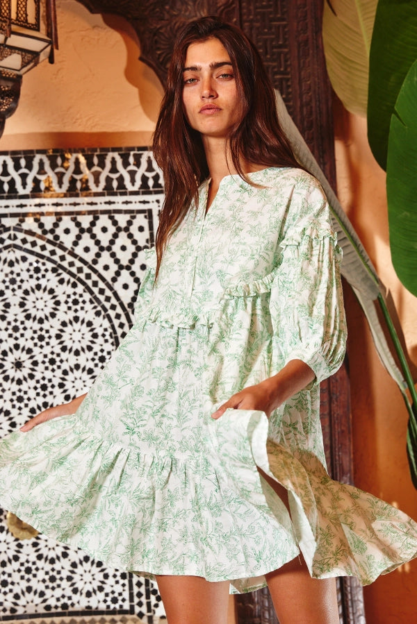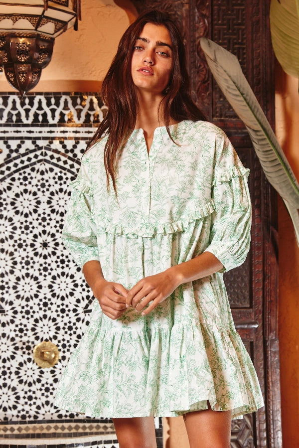 Button Up Stand Collar Ruffle Tiered Floral Mini Dress - 3/4 Puff sleeves - Ruffle detail - Loose fit - Button up at front