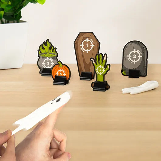 - Includes everything you need – 10 sticky ghost slingers, 5 haunted targets with stands, and full instructions