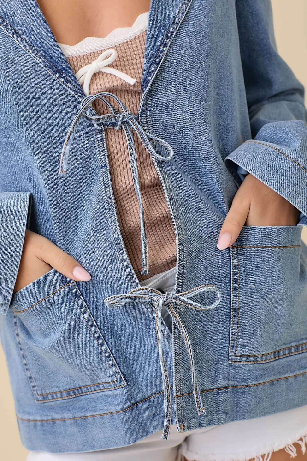 Lapel Collar Denim Jacket With Front Tie Detail