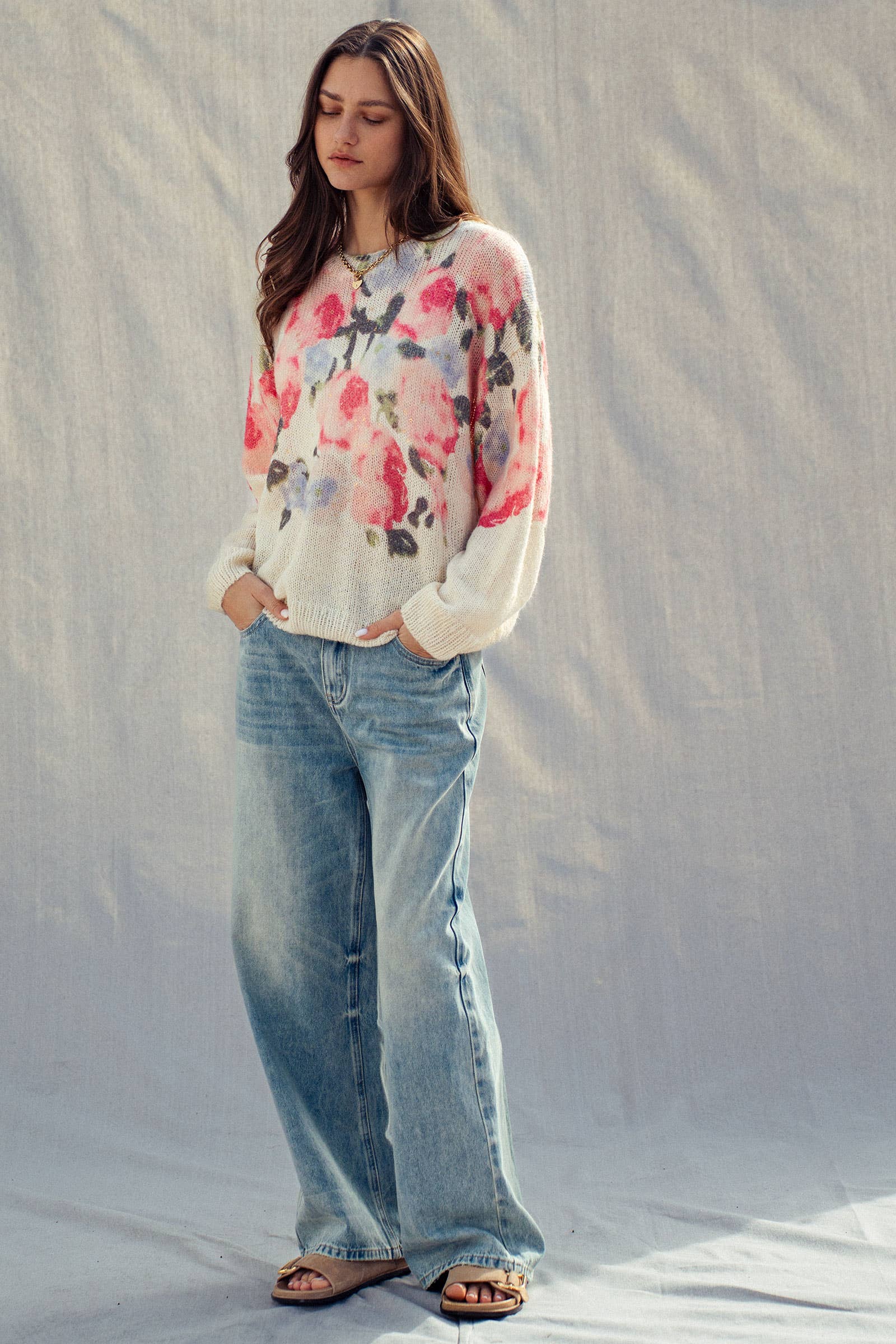 Infuse your knitwear assortment with romantic charm using this floral pullover. The design highlights a bold pink rose pattern against a cream backdrop, crafted from a soft, fuzzy knit that ensures comfort for everyday styling.