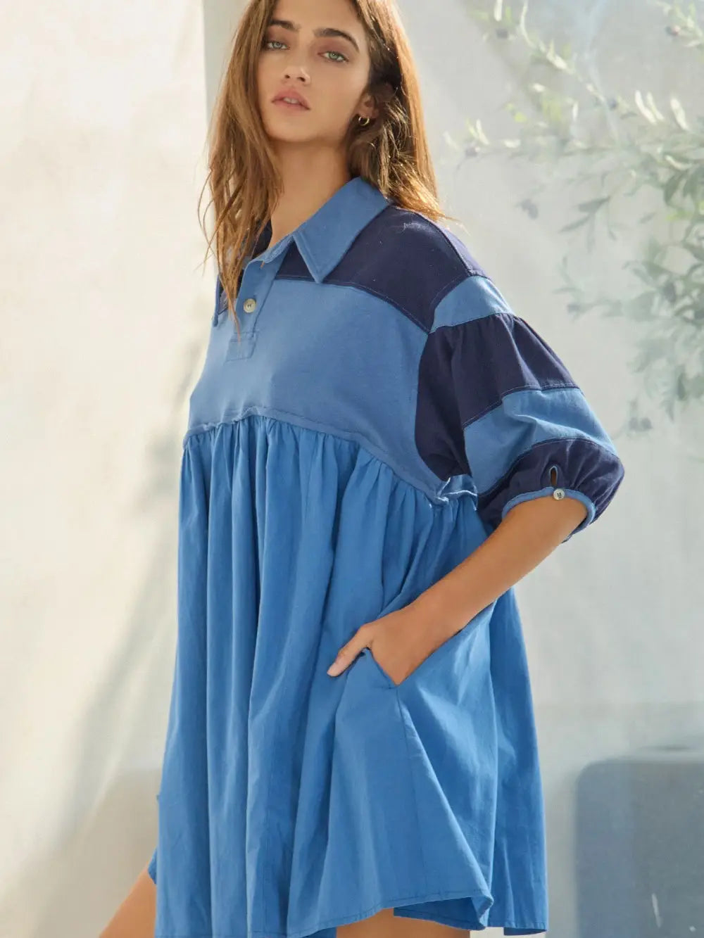 Billowy Shapeless Silhouette Rugby Mini Dress - Collared - Button-up closure - 3/4 sleeves - Color-block contrast details - Pleated hemline for added shape