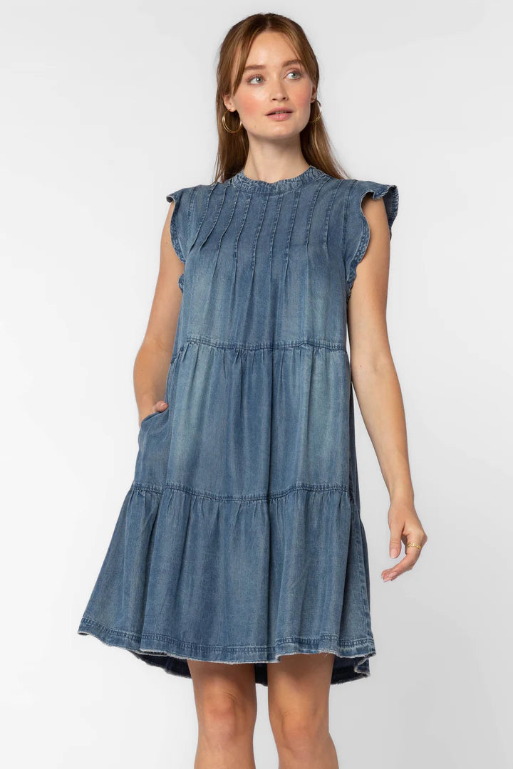 The Shelly sleeveless babydoll dress features ruffle sleeves, front pintuck details, and a back button closure. It's pop-over style with delicate details elevates an effortless look.