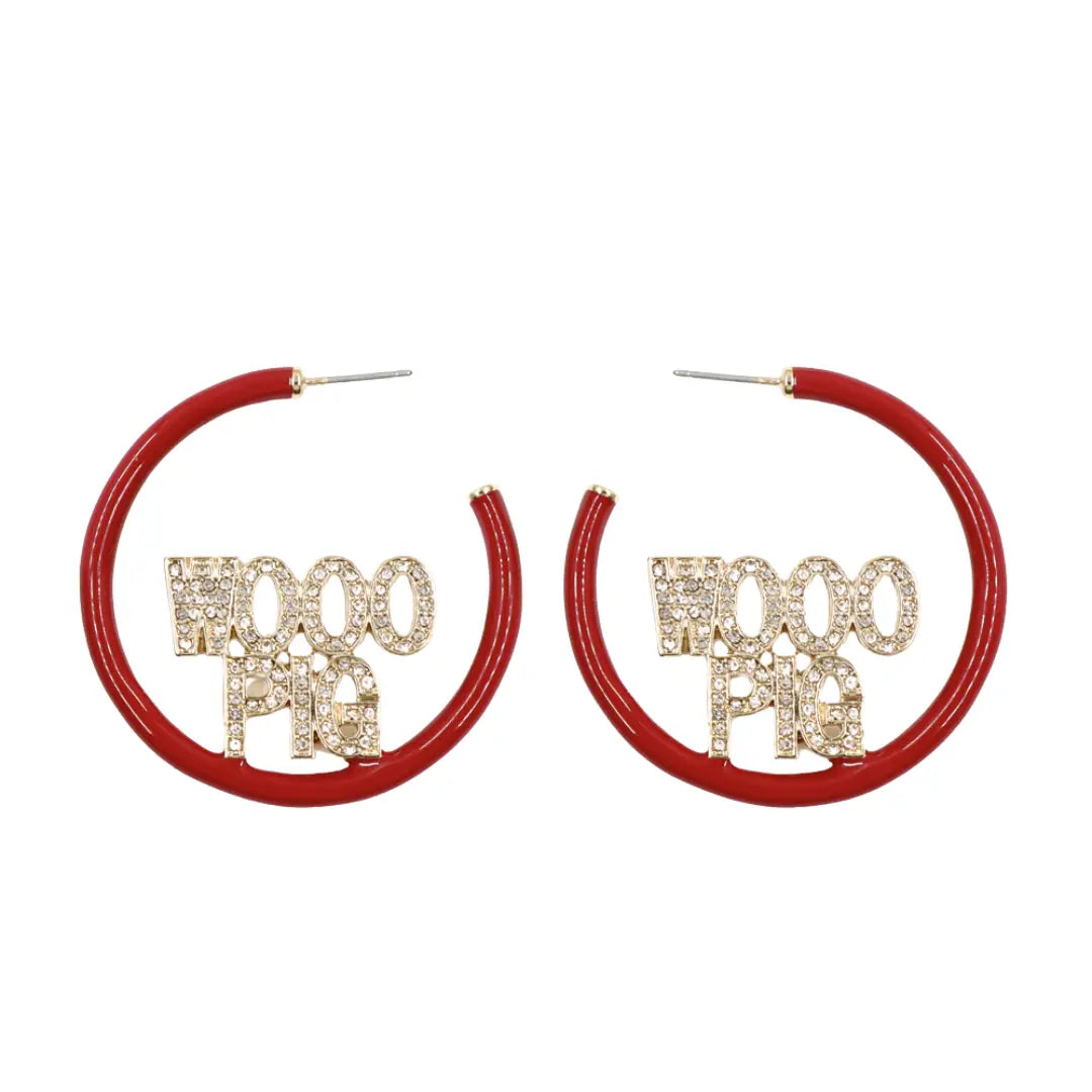* This is an Officially Licensed Collegiate Product * Cardinal Red Enamel University of Arkansas Hoop Earrings with Pavé WOOO PIG * Measures 1.5" in length